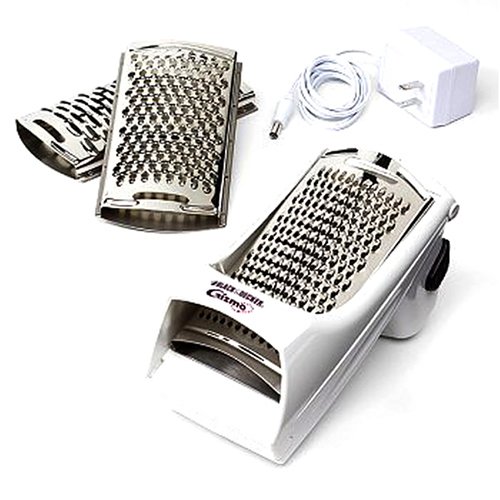 Black & Decker Cordless Gizmo Grater. Cordless freedom allows grating on top of your dish. The blades do all the work at the touch of a button and is easy to use. The three blade accessories are easily interchangeable for all your grating needs. Use the fine grating blade for hard cheeses, coarse grating for soft cheeses such as cheddar and the shaving blade works best for chocolate, coconut and other dry foods. Parts in contact with food are dishwasher safe. Versatile storage is perfect on the wall, in a drawer or on the counter.